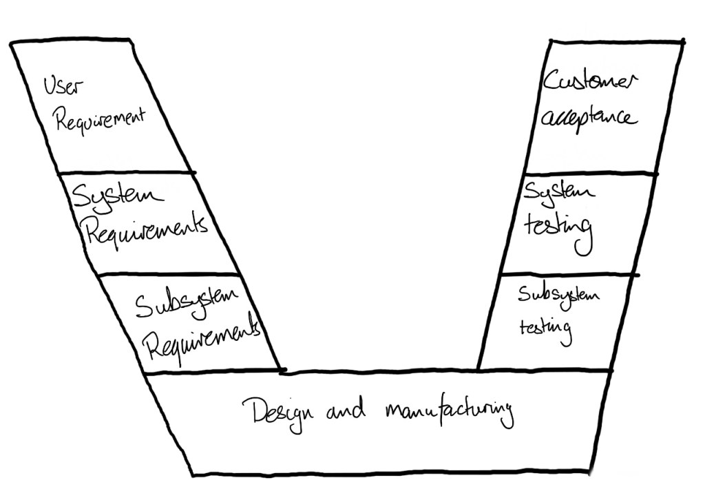 This diagram serves as an excellent representation of the Plan-Do-Check-Act (PDCA) cycle. As we descend the V, we plan the final design of the product through effective requirements management. At the nadir of the V, the ‘Do’ phase is completed with the finalisation of the design. Ascending the V, we ‘Check’ our work against our ‘Plan’ (requirements) to ensure alignment and correctness. The final step Act can refer to moving to the next stage of the project or to go back and revise the Plan (requirements) and repeat the PDCA process until we reach a satisfactory result.